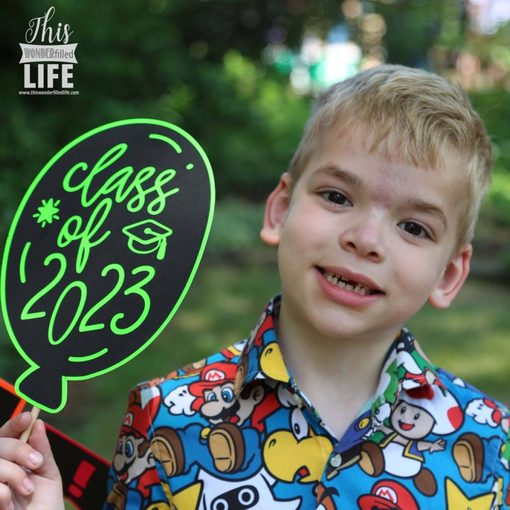 When it came to Bubba graduating from Kindergarten I struggled even more. When P was in Kindergarten the pandemic hit, so we didn’t get to experience any of the traditional Kindergarten “rites of passage” and because I swore off being a room parent with more than one other person (his class had like, 15?!?!?) I knew I would have to just sit back and watch some of the planning and event prep from the sideline. But…I also knew I wanted to make it special for him in some way. I remember being with Super at breakfast a few weeks before the Kindy celebration was set to happen and talking about how cute it would be to make some photo props to bring just for Bubba to use after the presentation…and then that thought quickly ballooned to making photo props for everyone to use and how I could just show up with them…but I wasn’t sure how that would be received since I wouldn’t have “cleared” that with the parent led organizing team. Super said to go with my gut, so I landed on just making a few choice ones that Bubba would probably think were clever and leave it at that…and then, literally, within an hour an email from the team went out to the Kindy parents explaining that the organizing team had everything set for the big day EXCEPT did anyone have a chalk board photo prop they could borrow for some photos after the celebration. I couldn’t believe that the universe just dropped the okay right in my lap! I wrote the team back that I had actually just been designing some ideas for photo props for Bubba and that I’d be happy to make a bunch for the occasion and that grab and go props would probably be quicker than a chalkboard we’d have to clean and re-write between families. With the okay from the committee I forged ahead and started designing.