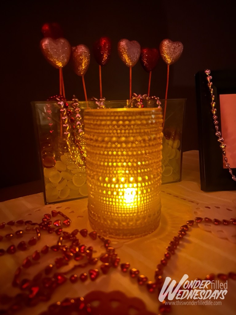 I have plans to make a long, wooden candle holders/centerpiece this spring but for now it was beautiful to have these colorful pieces of glass in and around all our Love Heart (Valentines) Day decorations.