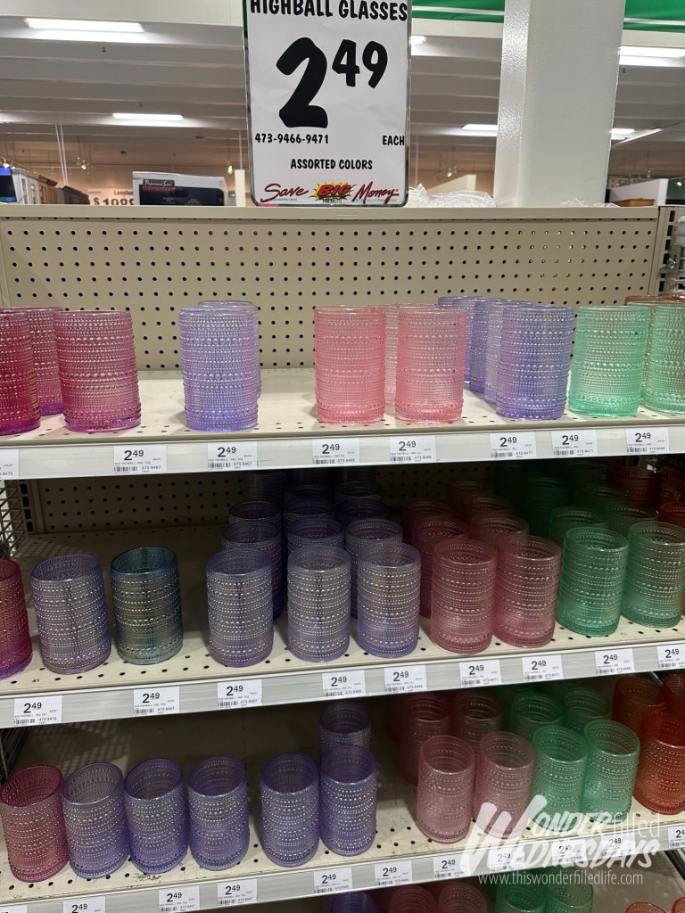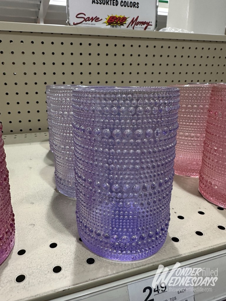 On our latest outing we hit up the kitchen/dinnerware aisle. I was looking for some shallow crème brûlée dishes…I did not find them there (but I DID find them at our next stop) but as we were perusing the kitchen appliances and bakeware this end cap of glasses caught my eye. Over the years we’ve lost, broken, thrown out many of our drinking glasses and I was taken back by how pretty these glasses on this end cap were. I asked Super if he thought we should grab some…and at the price of $2.50/ea it seemed like a no brainer. So I grabbed one of each color and then decided that I might instantly regret giving these to my children to use but instead they may make better decorative candle holders. Super actually suggested I text our favorite candle maker and let her know about these gorgeous and affordable vessels. Wouldn’t a hand poured pillar candle be just gorgeous in here?