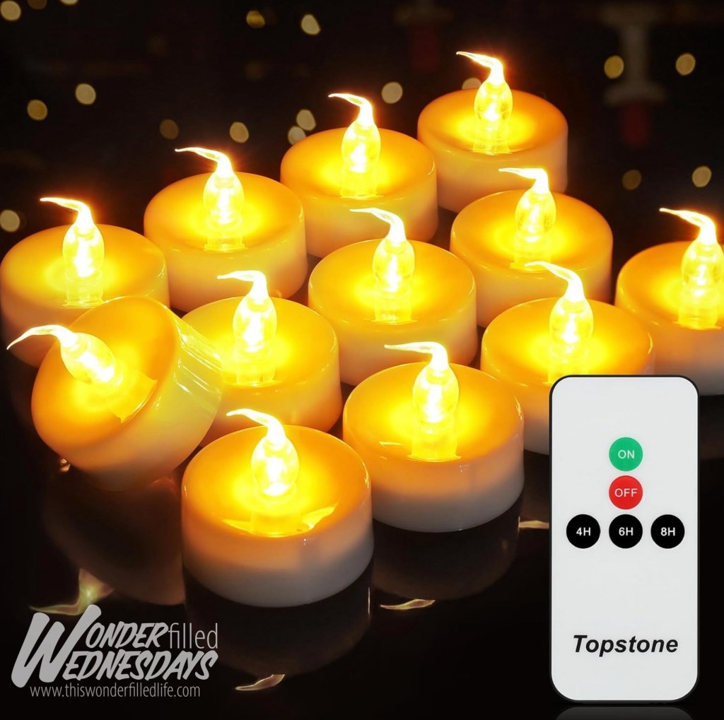 Bonus is that I use these fantastic remote control tealights. What I like about them is that you can turn them on with the remote and click 4, 6 or 8 hours, in addition to just on and off. Not only do the candles automatically turn off in the allotted time BUT they will also continue to turn on at the same time daily. So I don’t have to think about turning them on or off! Or burning down my house. BONUS! My only negative about these is that after a few weeks the batteries do need to be replaced. Do they make rechargeable button batteries??