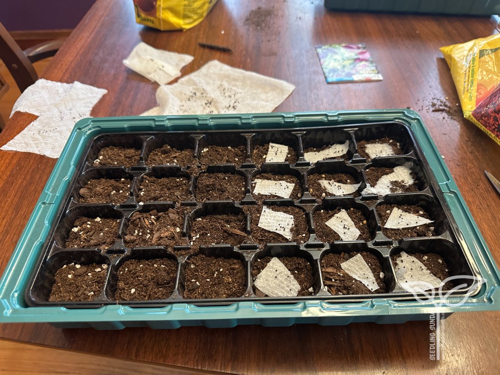 They were stuck to the wet paper towels..ugh..so I took a chance and just cut up the towel and planted it with the seeds. Will it work? Who knows! But I plan to update you all here weekly this spring, partly because Bubba wants to keep everyone informed about his plant progress as well!