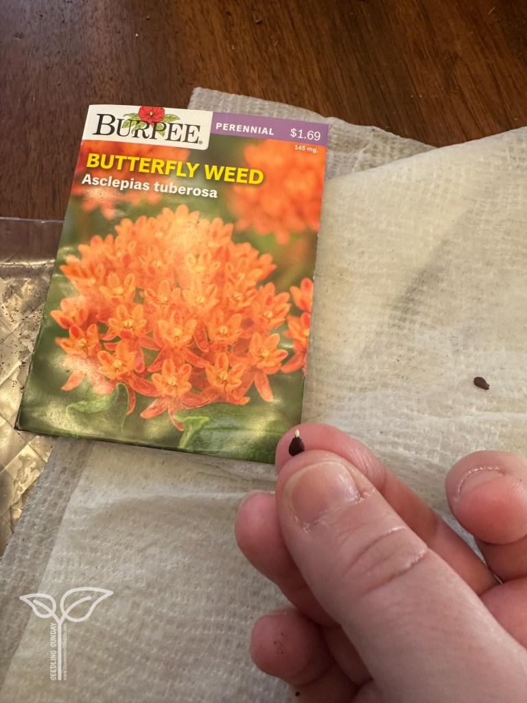 I did learn a trick last time I germinated from scratch. Wet a paper towel, squeeze out the excess and empty your seed pack onto the towel. Cover with another layer of wet paper towel or just fold your towel in half and place in a ziplock bag for a day or two. The water helps speed up the process of the seed sprouting! Don’t believe me? I placed these in wet towels and left them for less than 48 hours and…check out my Butterfly Weed seedling here.